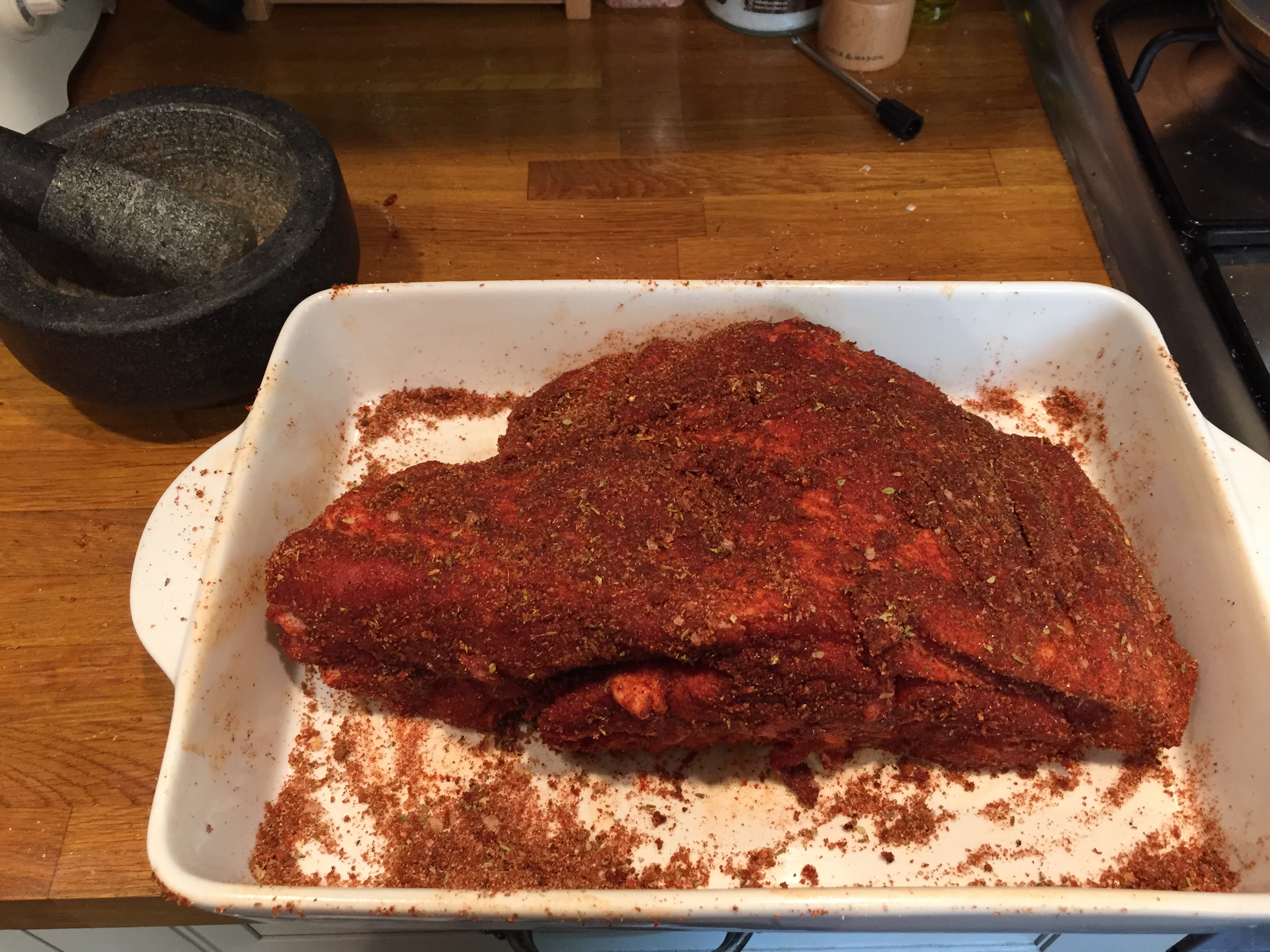 Now came the prep, first I injected the shoulder with a mixture of cider, water and Worcestershire sauce and then it was on with the all important rub. I used Pitt Cue’s house rub, which made up of a number of spices such as cayenne, cumin, coriander, and paprika as well as fennel seeds, oregano and lots of salt, pepper. I rubbed this all over until I had something like this (looks awesome doesnt it!)