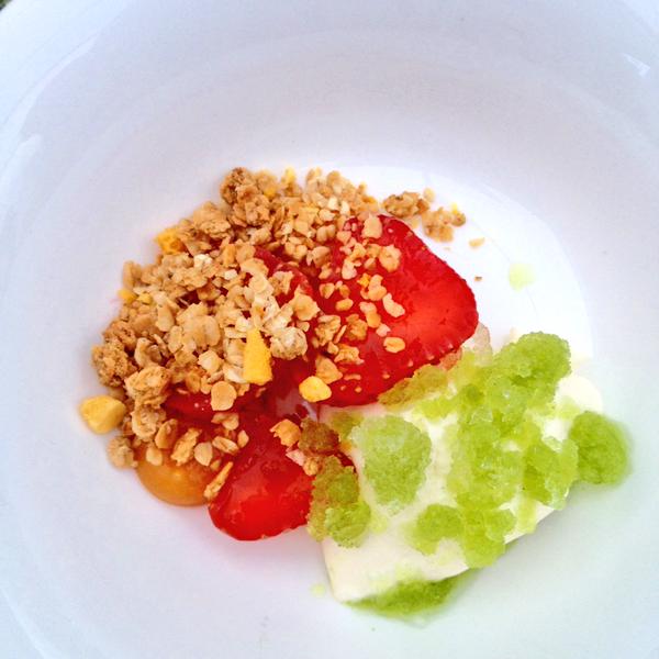 Ben’s dish was the dessert which was strawberries, served with aerated yoghurt, apricot puree, oat crumb and a delicious sweet cicely snow. Cicely is a plant similar to bracken, Ben took this and used it as a base for a granita – bright green in colour with a subtle aniseed taste, unusual but very refreshing.