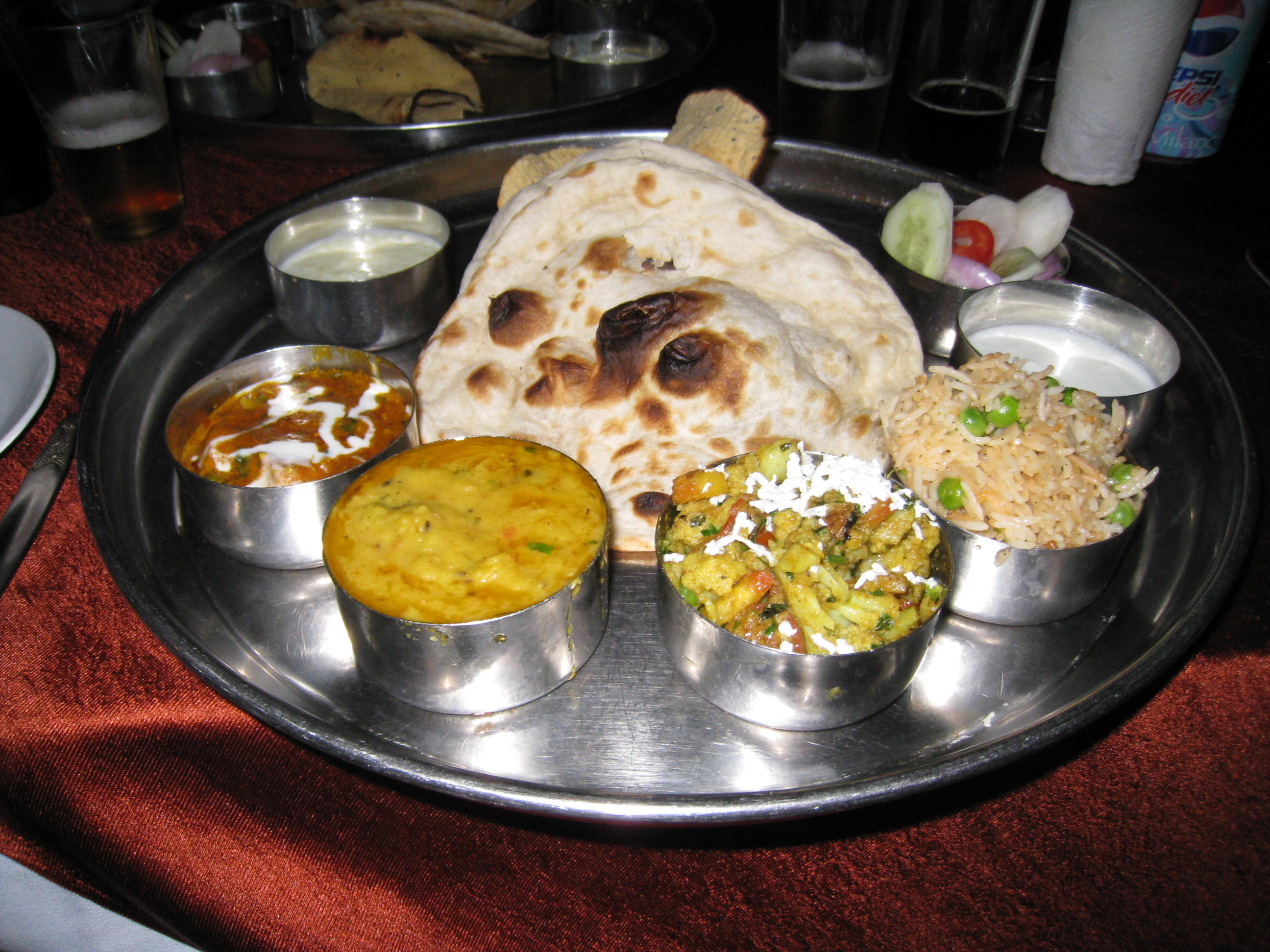 The local dishes in Rajasthan were often served as a Thali, a platter of 2 or 3 curries (usually 1 meat and the rest veggie) some rice, a raita, some naan and a dessert as well – this usually cost about a pound, and was different in every place. It was always heavily spiced, nice and spicy (once or twice maybe a little too spicy for my English Pallet) but was always completely different and such a great way to try lots of different curries.