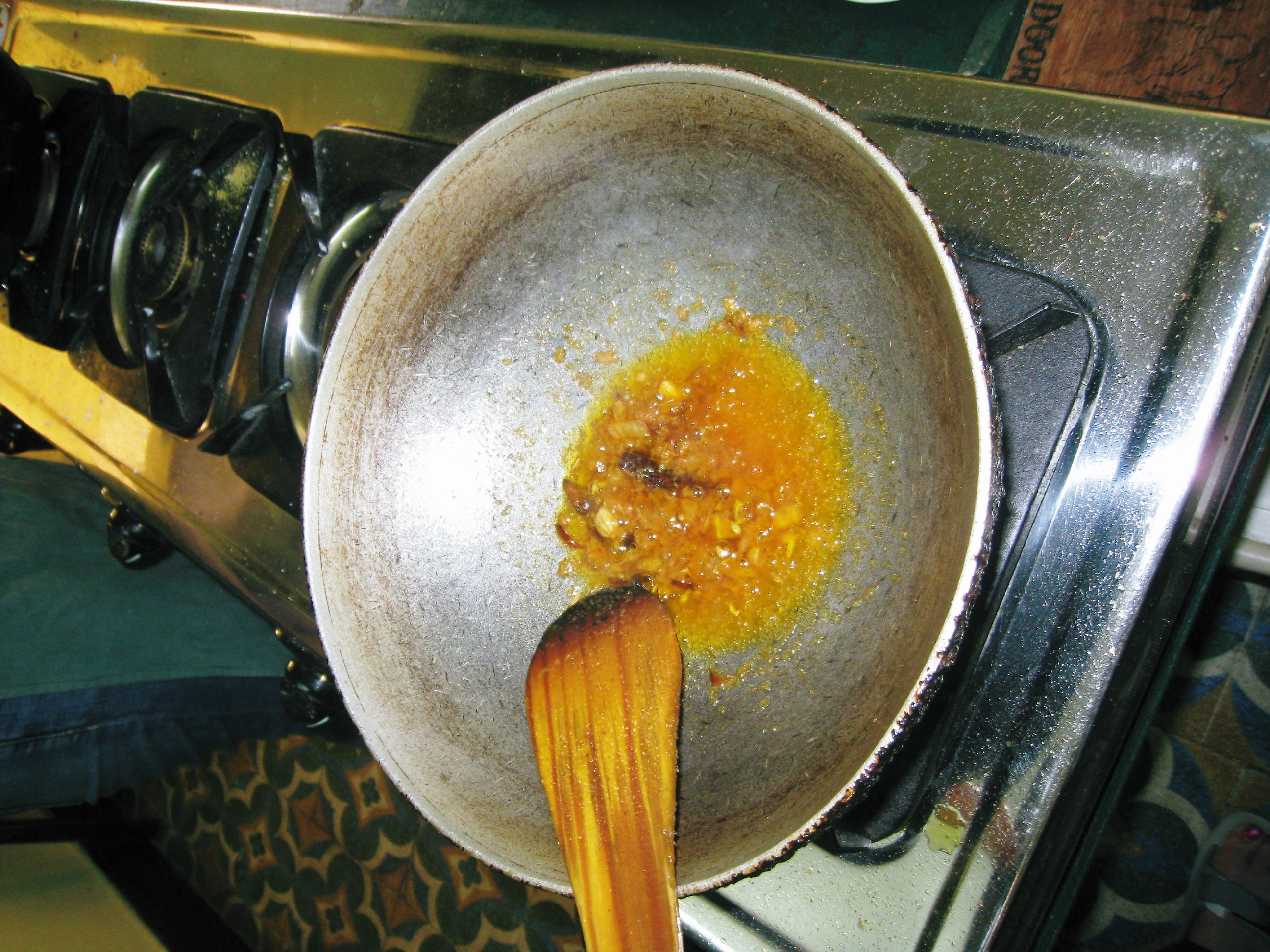 4 – Once onions are brown add in powdered spices, the paste (see above) and 1/4 cup of water