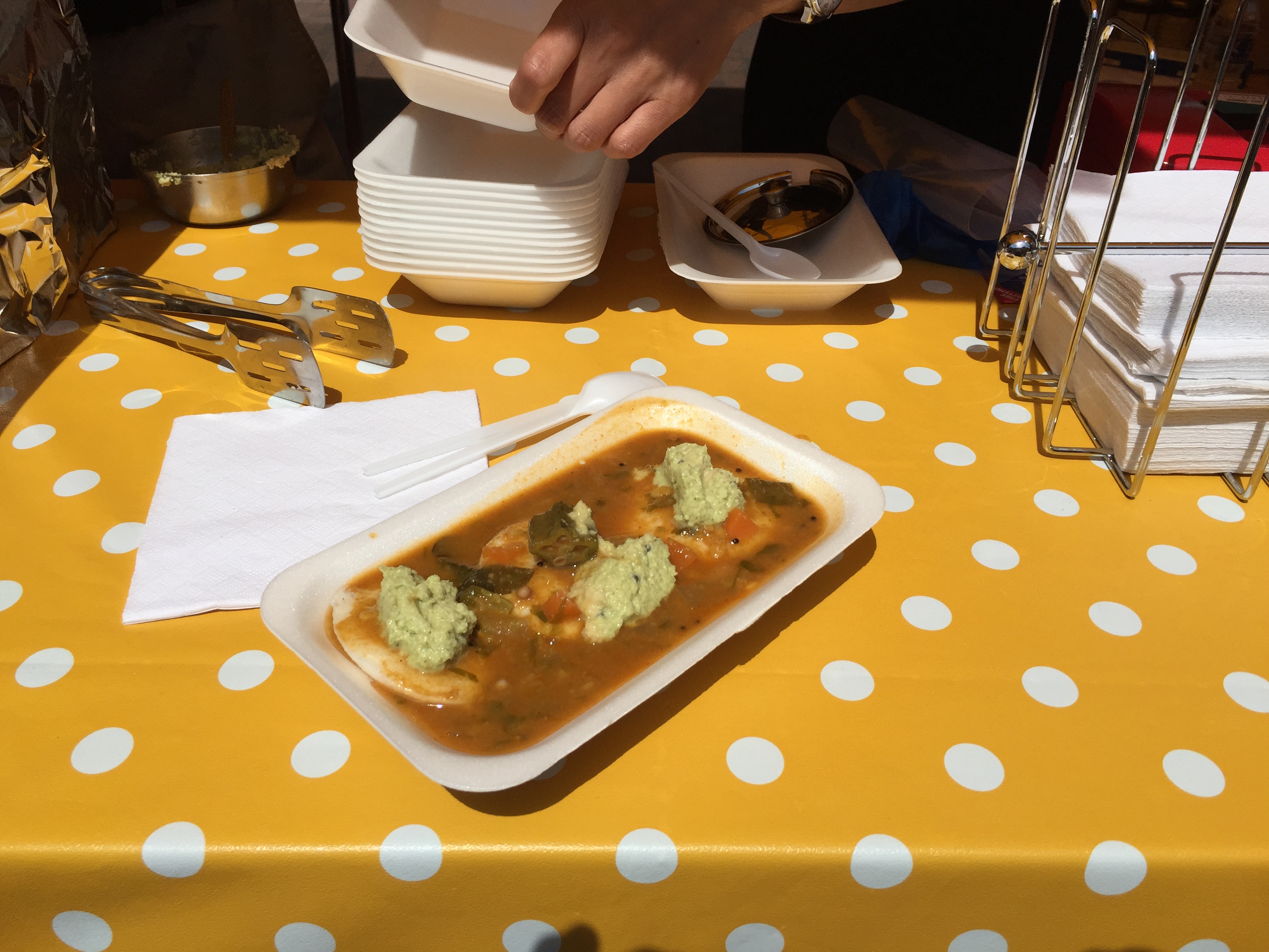But the highlight was something that I had not tried before from the Indian stall and that was called Idli and Sambar. Idli’s are small round pancakes made from lentils and rice, they are light and fluffy, not much flavour but they satisfyingly melt in the mouth.