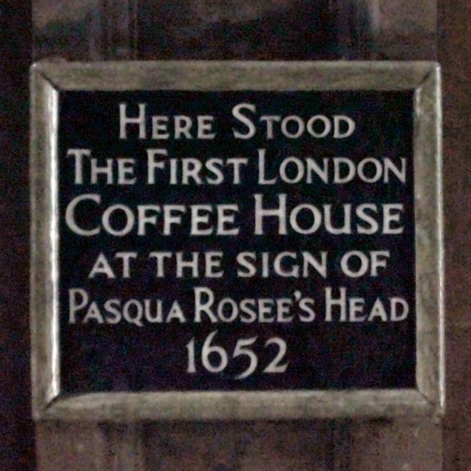 We know that coffee was introduced into England towards the end of the 16th Century, mainly through the East India Trading Company who imported this from the East. It was however a man called Pasqua Rosee who we can thank for really starting the English love affair with coffee who in around 1652 set up the first Coffee Shop in England, situated in St Michaels alley, Cornhill (near Bank and Leadenhall Market). Today this coffee shop is now a pub (obvs) but there is a plaque commemorating it: