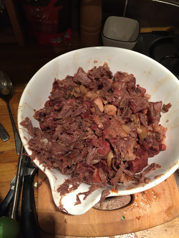 After this was done, I removed all the meat and veg from the pan and reduced the liquid. I added some arrowroot at this stage to speed it up, as was starting to run out of time. As this was working its magic, I stripped the meat off the oxtail, a messy, but satisfying job! and added this all together ending up with a bowl full of beef, bacon and the odd token bit of veg – it looked immense, and smelt even better.
