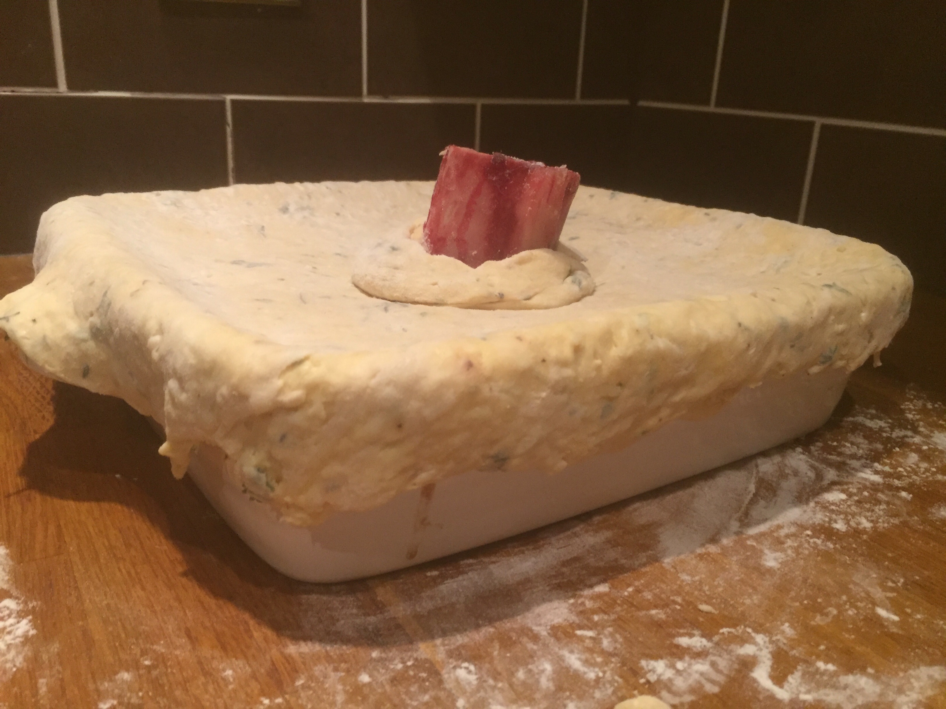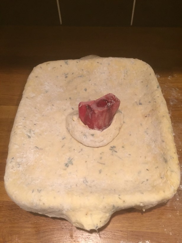Whilst this was marinating, I cracked on with the pastry. I love making pastry, it’s messy and frustrating, and as it is all judged by hand quite tricky to get right sometimes. This recipe continued the theme of being different from every other recipe by using iced milk instead of water or melted butter. This in the end was inspired and really made this dish extra special. So flour was mixed with baking powder and salt and lots of thyme leaves. Butter was then grated in alongside suet. 4 egg yolks were then added and then the milk was added in until it resembled pastry. I kneaded this very little, only to bind it, as I didn’t want to loose all the bubbles so I had a little rise and nice, crispy light pastry for the top of the pie. Once done this was wrapped in clingfilm and put in the fridge.