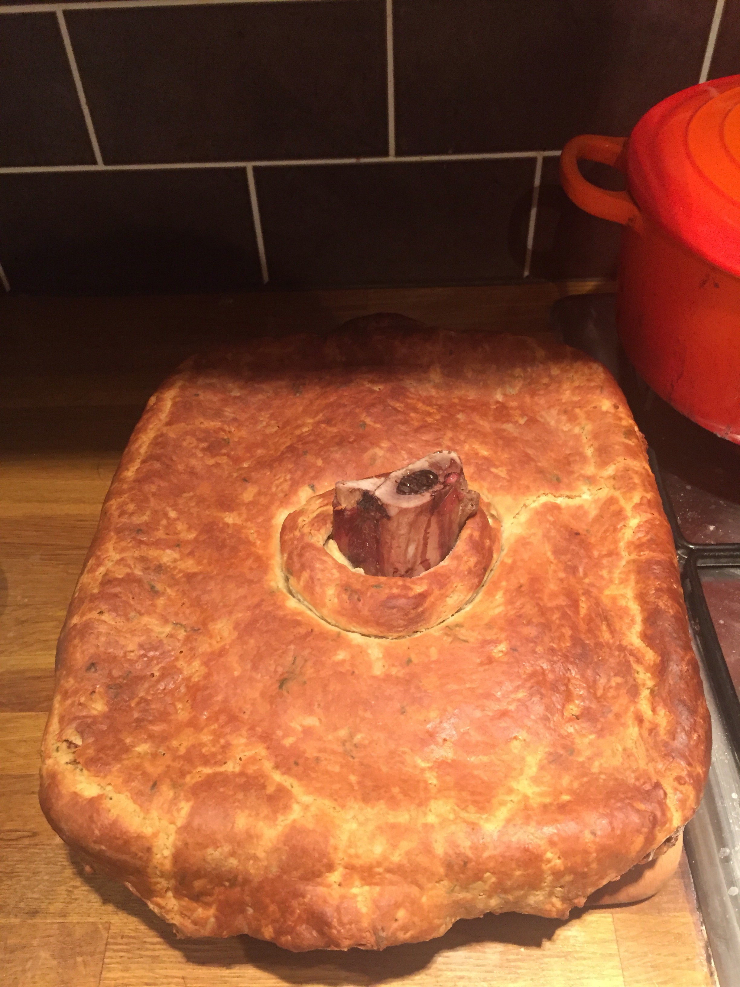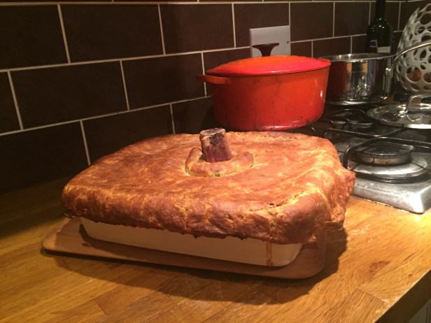 Once the liquid was reduced everything went back in the pan, alongside some stilton cheese and this was cooled until I was ready to build. First went the meat mixture, then I stuck the marrow bone right in the centre so it protruded above the meat. The pastry was then rolled out and then put (very carefully) over the top of the pie. I cut a hole out of the middle so the marrow stuck out like a pie flute, and then trimmed the edges. Finally milk was brushed on the top. Producing this rather magnificent pie ready for the oven.